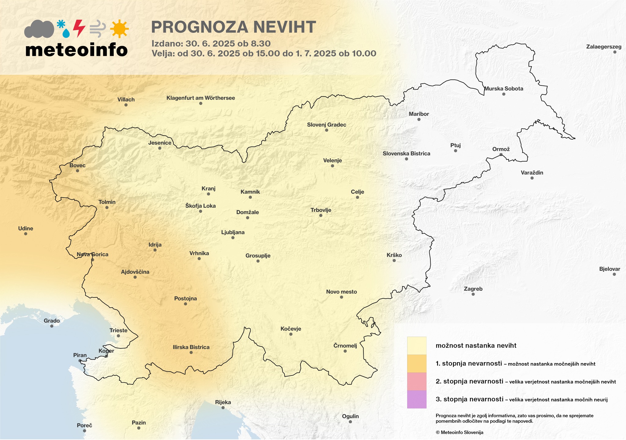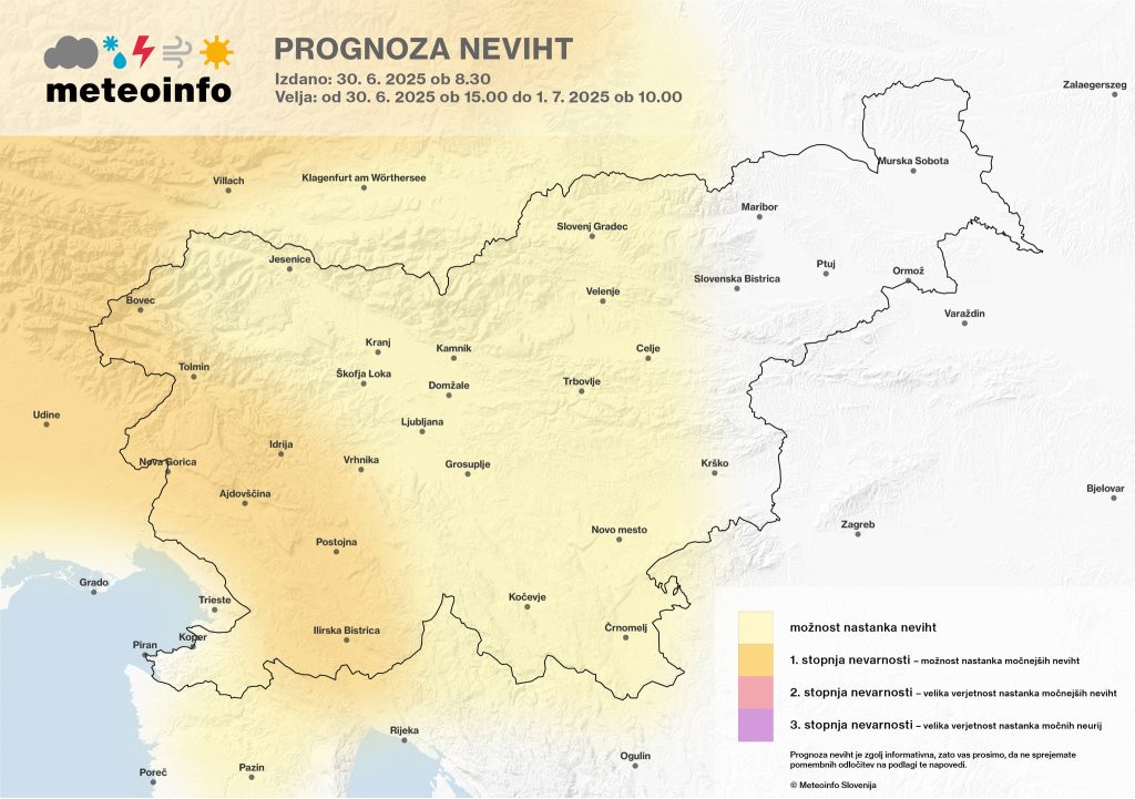 Sistem informiranja o predvidenih vremenskih ujmah na naših straneh ne velja kot opozorilni sistem. Napovedi in zemljevidi, ki so dosegljivi na tej spletni strani, so informativne narave in zatorej ne odgovarjamo za morebitna odstopanja ter nastalo škodo ob neurjih ali ob ukrepih za zaščito pred njimi. Meteorološka služba Agencije Republike Slovenije za okolje (ARSO) je na območju Republike Slovenije edina zakonsko pooblaščena za izdajo vremenskih opozoril! Uradna opozorila najdete na njihovih spletnih straneh ali na spletni strani Meteoalarm.