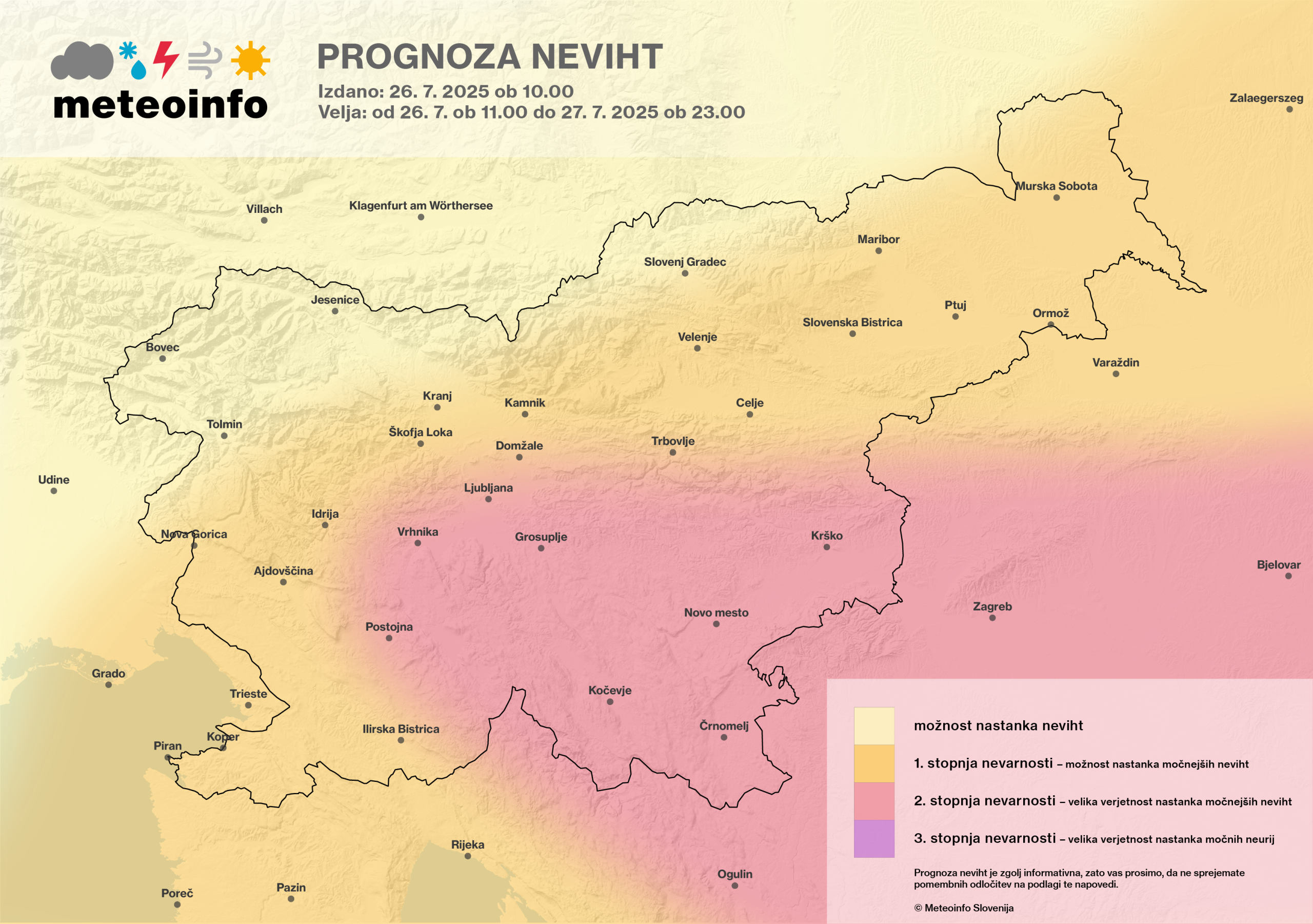 Sistem informiranja o predvidenih vremenskih ujmah na naših straneh ne velja kot opozorilni sistem. Napovedi in zemljevidi, ki so dosegljivi na tej spletni strani, so informativne narave in zatorej ne odgovarjamo za morebitna odstopanja ter nastalo škodo ob neurjih ali ob ukrepih za zaščito pred njimi. Meteorološka služba Agencije Republike Slovenije za okolje (ARSO) je na območju Republike Slovenije edina zakonsko pooblaščena za izdajo vremenskih opozoril! Uradna opozorila najdete na njihovih spletnih straneh ali na spletni strani Meteoalarm.