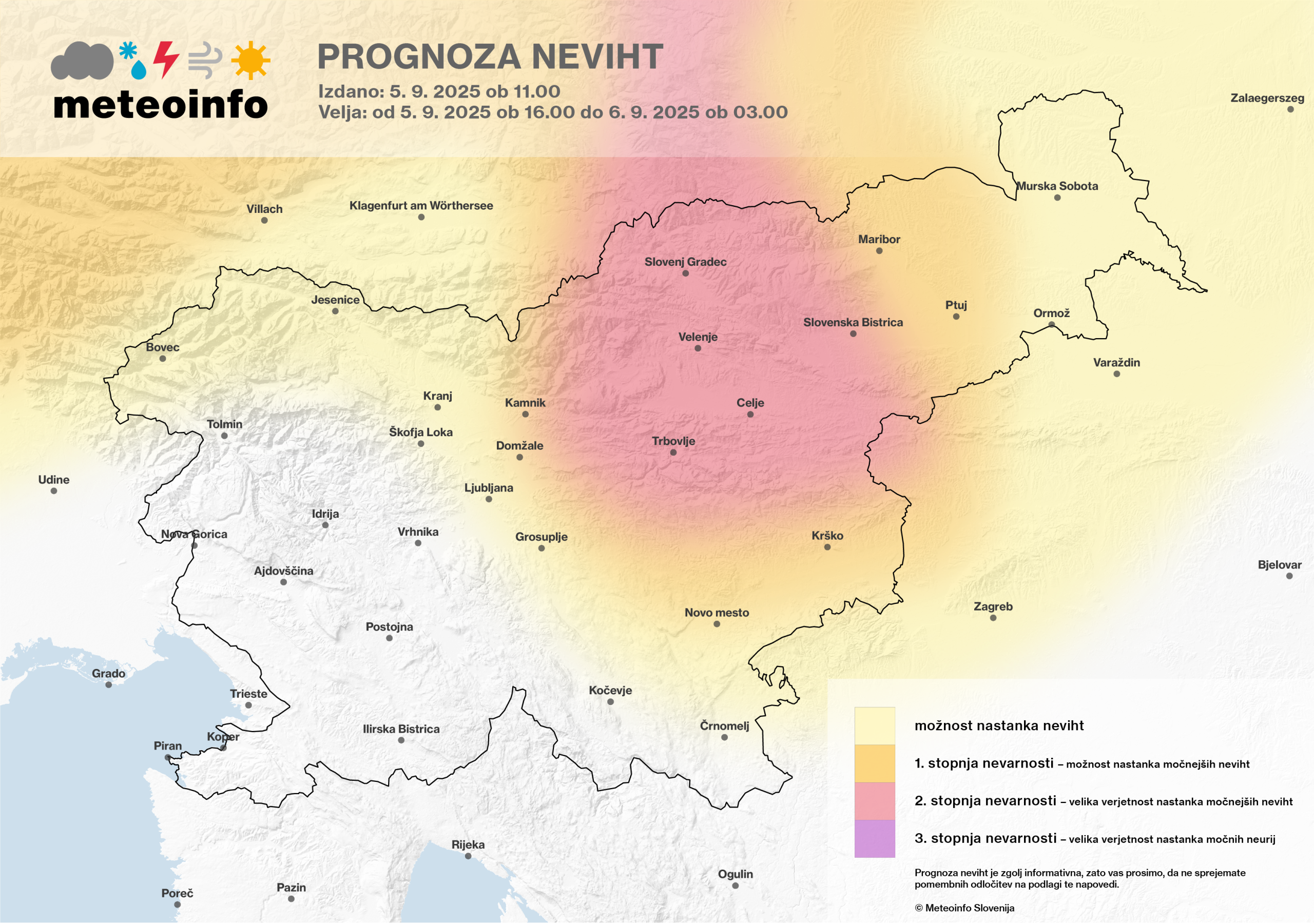 Sistem informiranja o predvidenih vremenskih ujmah na naših straneh ne velja kot opozorilni sistem. Napovedi in zemljevidi, ki so dosegljivi na tej spletni strani, so informativne narave in zatorej ne odgovarjamo za morebitna odstopanja ter nastalo škodo ob neurjih ali ob ukrepih za zaščito pred njimi. Meteorološka služba Agencije Republike Slovenije za okolje (ARSO) je na območju Republike Slovenije edina zakonsko pooblaščena za izdajo vremenskih opozoril! Uradna opozorila najdete na njihovih spletnih straneh ali na spletni strani Meteoalarm.