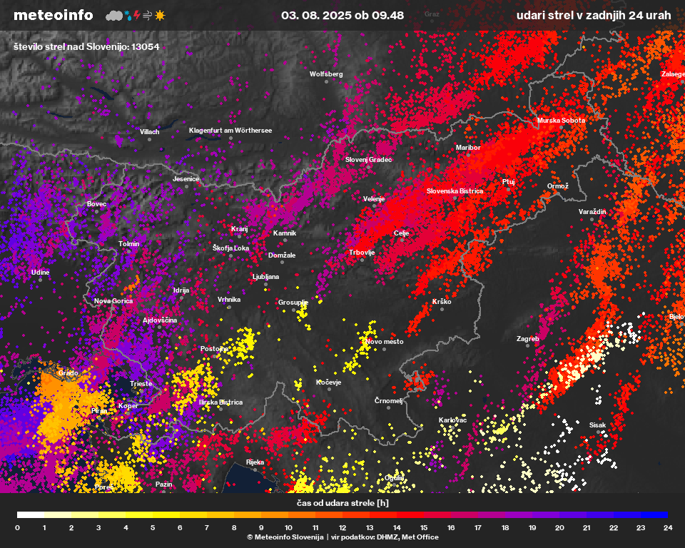 Da je bilo ozračje nad Slovenijo v soboto resnično zelo nestabilno priča tudi ta podatek. Skupno je bilo nad Slovenijo zabeleženih 13.000 razelektritev/strel. Nekatere od njih so ujeli tudi našo lovci na nevihte. Glede na sliko udarov strel je bilo dogajanje najbolj nevihtno nad severovzhodno Slovenijo ter na Primorskem, najmanj “akcije” pa je vreme ponudilo nad osrednjim in jugovzhodnim delom države.