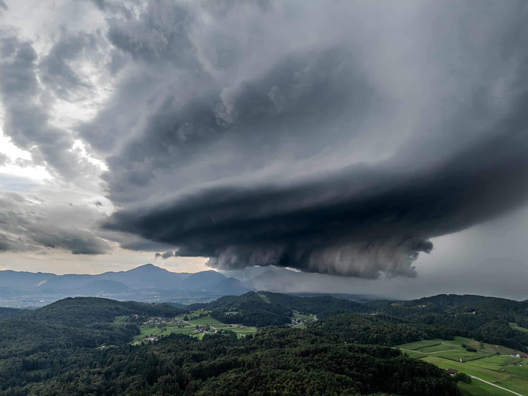 Pogled na izjemno fotogenično strukturo supercelične nevihte iz Ponikve pri Žalcu proti Savinjski dolini.