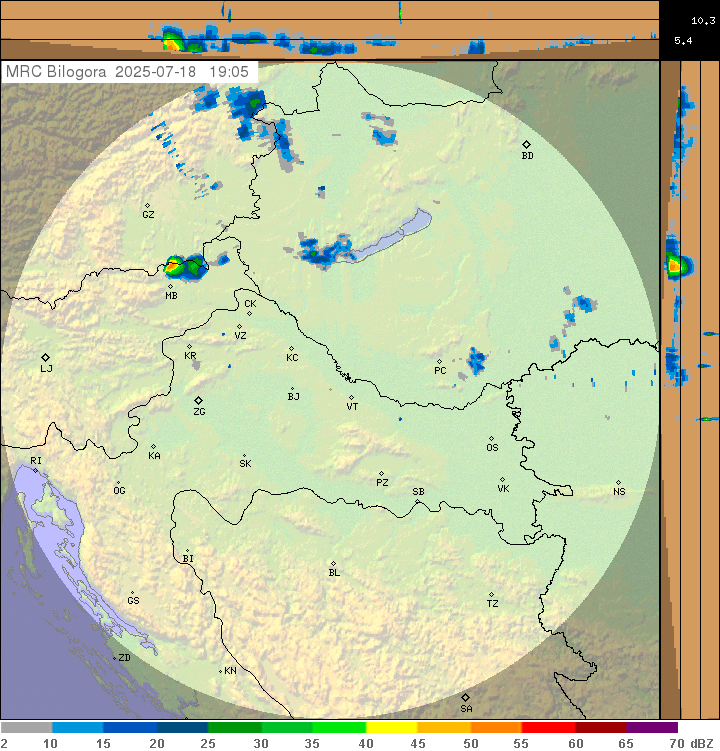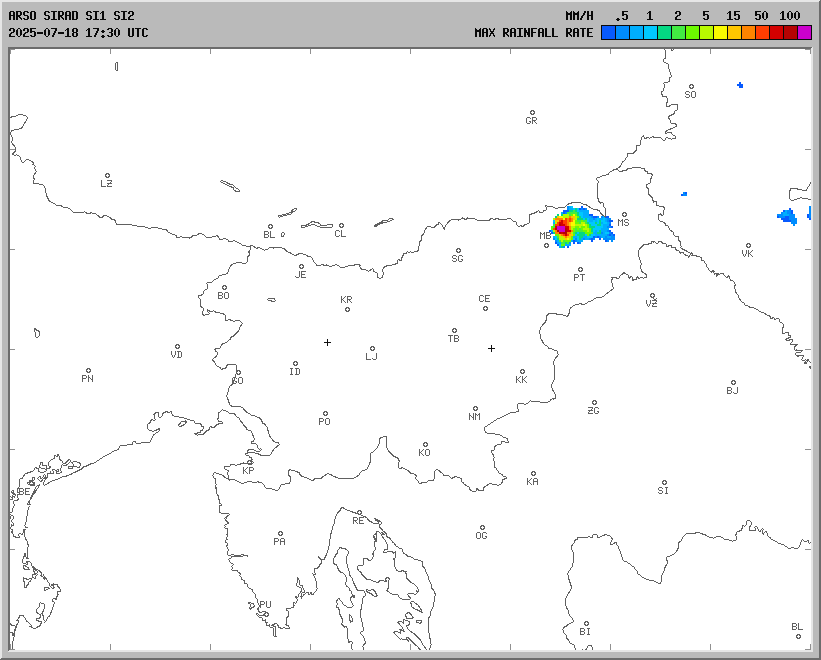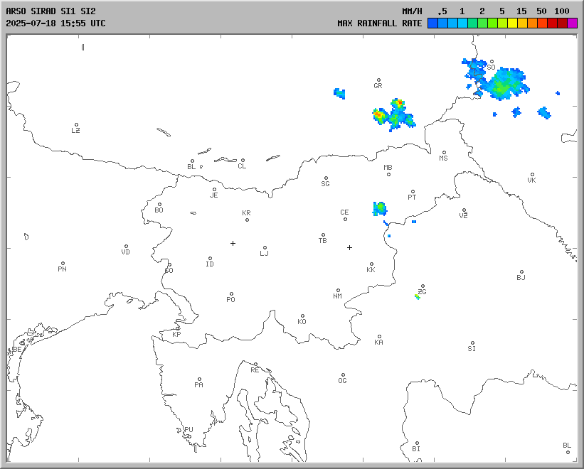 Radarska slika padavin: Vir: Arso in DHMZ