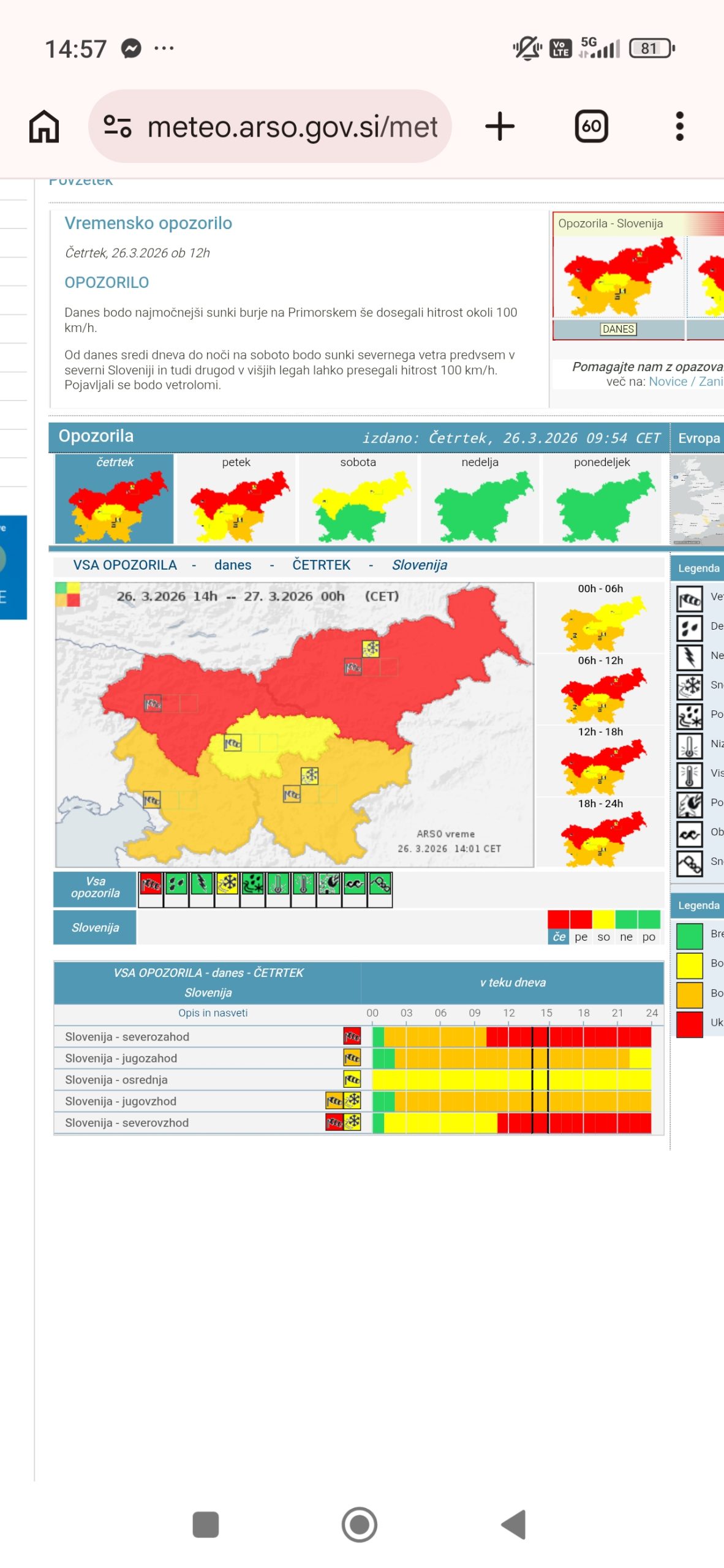 Za severozahod in severovzhod je ARSO izdal rdeče opozorilo.